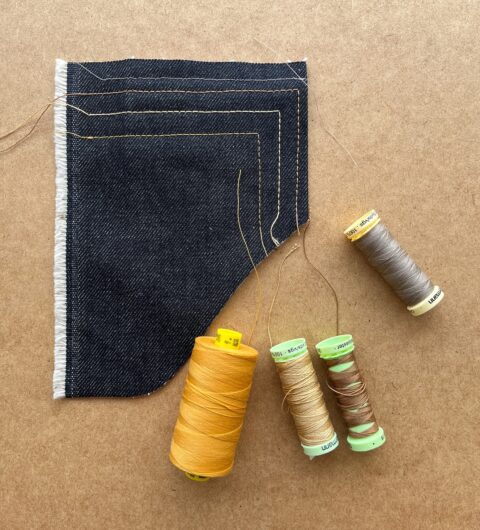 Recommandation de fil : pour les surpiqûres du denim épais, je recommande le Gütermann Mara 80 (à gauche sur la photo suivante). Sinon, un fil à coudre Gütermann classique est parfait pour les tissus plus légers (à droite). Je trouve le fil de surpiqûre Gütermann (au centre x2) trop épais, je ne l’utilise donc pas, mais c’est une préférence personnelle.