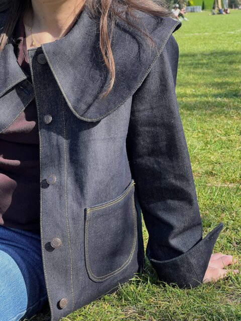 Ce n’est pas la première fois que je propose un col Claudine dans un patron. Vous souvenez-vous de la robe Paulette ? J’adore les cols originaux, mais j’hésitais à l’associer à un vêtement d’extérieur comme une veste en jean. Je l’ai dessiné, j’ai fait une toile et j’ai tout de suite été convaincue ! C’est même celui que je mets le plus en avant, pour son originalité.