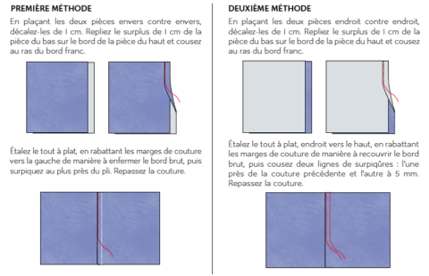 J’ai appris qu’en usine de confection, on utilise d’autres méthodes pour réaliser des coutures rabattues. Dans les usines spécialisées ce sont même des machines spéciales avec des pieds de biche spéciaux qui sont utilisés. C’est pourquoi, dans ce patron, j’enseigne deux autres techniques de couture rabattues que l’on peut faire avec une machine domestique. Je ne prétends pas qu’il s’agisse des meilleures méthodes pour réaliser des coutures rabattues, ni que ce sont les plus simples. Ce sont simplement les techniques utilisées par les professionnels.
